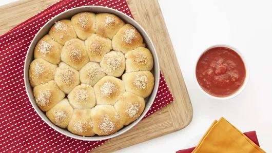 Step4Bake 20 to 25 minutes or until golden brown and biscuits are no longer doughy in center. Serve warm biscuits with warm marinara sauce for dipping.