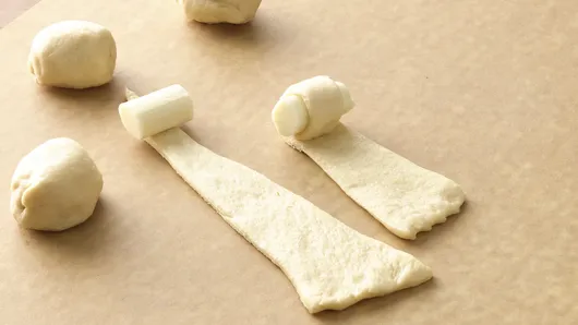 Step4Place 1 piece of cheese on pointed end of triangle, and roll up completely. Fold edges around cheese; press to close. Repeat with remaining dough and cheese.