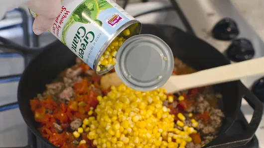 Step3To skillet with cooked beef, add 2 cans (10 oz each) diced tomatoes with green chiles, 1 can (15.25 oz) whole kernel sweet corn, 1 package (1 oz) Old El Paso™ taco seasoning mix, 1 roasted red bell pepper (from a jar), chopped, and 1/2 cup water; mix well.