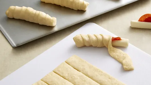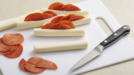 Step1Heat oven to 400°F. Unwrap string cheese, and cut a 2-inch slit along one side of each, leaving ends intact. Cut pepperoni slices in half, and insert 4 halves into each cut side of mozzarella sticks.