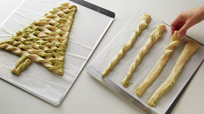 Brush top of tree and breadsticks with melted butter, and sprinkle with Parmesan cheese. Bake separately, refrigerating second sheet while first is baking. For the breadsticks: Bake 10 to 12 minutes or until dough is golden brown and cooked all the way through. Cover loosely with foil to keep warm. For the tree: Bake 16 to 21 minutes, or until dough is golden brown and cooked all the way through.