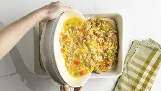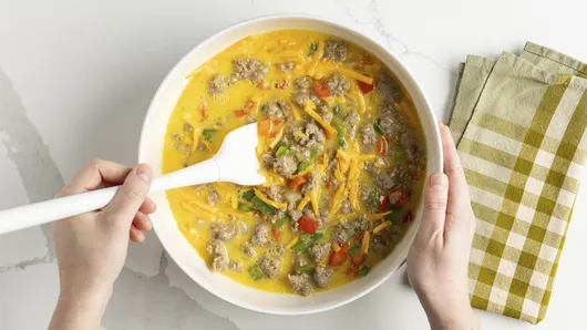 Step2In large bowl, beat eggs. Stir in cheese and sausage mixture. Separate dough into 8 biscuits. Press biscuits into bottom of baking dish. Pour sausage mixture over biscuit crust.
