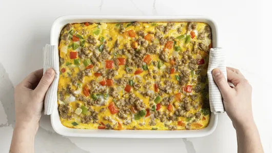 Decorate your brunch buffet with a fabulous egg casserole, decked with red and green peppers and a tender no-fuss crust.