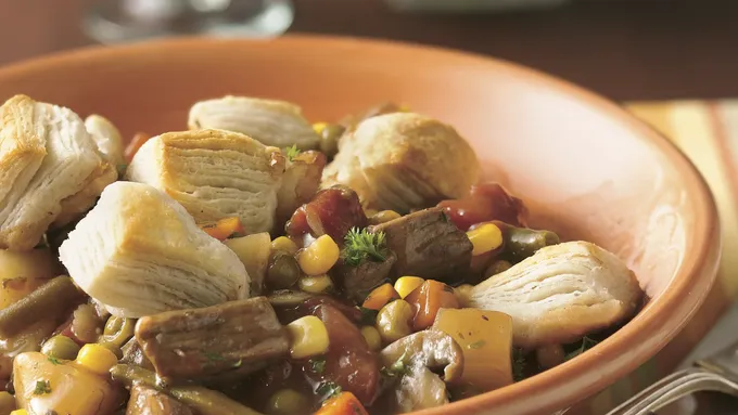 Step4Pour cheese sauce evenly over beef and vegetables in dish. Separate dough into 8 biscuits; arrange evenly over top.