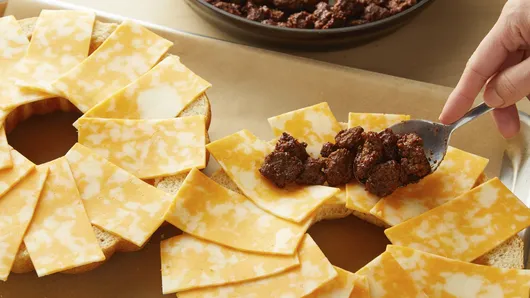 var configuration = {"title":"Cheesy Taco Beef Bundtwich","introduction":"Think outside the shell with this taco Bundtwich that’s filled with all of your favorite classic ingredients. Not only is it delicious, it’s also a no-fail way to serve tacos at a party, whether you’re the host or bringing a dish.","servingSize":"1 Wedge","image":{"small":{"media":"(min-width: 0px)","src":"https://mojo.generalmills.com/api/public/content/AWlp-raYYEy9r8vKWcmZLQ_webp_base.webp?v=72da526a\u0026t=e724eca7b3c24a8aaa6e089ed9e611fd"},"medium":{"media":"(min-width: 500px)","src":"https://mojo.generalmills.com/api/public/content/AWlp-raYYEy9r8vKWcmZLQ_webp_base.webp?v=72da526a\u0026t=191ddcab8d1c415fa10fa00a14351227"},"large":{"media":"(min-width: 767px)","src":"https://mojo.generalmills.com/api/public/content/AWlp-raYYEy9r8vKWcmZLQ_webp_base.webp?v=72da526a\u0026t=191ddcab8d1c415fa10fa00a14351227"},"alt":"Cheesy Taco Beef Bundtwich"},"contributor":{"label":"By","name":"Pillsbury Kitchens","profileUrl":"/about-us","displayDate":{"label":"Updated","date":"Dec 21, 2018"}},"ingredientGroups":[{"ingredients":[{"quantity":"2","description":"cans (11 oz) refrigerated Pillsbury™ Original French Bread"},{"quantity":"1","description":"lb ground beef (at least 80% lean)"},{"quantity":"1","description":"packet (1 oz) Old El Paso™ Original Taco Seasoning Mix"},{"quantity":"1/3","description":"cup water"},{"quantity":"12","description":"slices (0.75 oz each) Colby-Monterey Jack or pepper Jack cheese, halved"},{"quantity":"1/4","description":"cup sliced onion"},{"quantity":"1","description":"cup shredded lettuce"},{"quantity":"2","description":"medium tomatoes, cut in 1/4-inch slices"}]}],"steps":[{"description":"Heat oven to 350°F. Spray 12-cup fluted tube cake pan with cooking spray."},{"description":"Remove dough from both cans; do not unroll. Place in pan in a circle; pinch both ends of dough firmly together to seal into 1 ring. Bake 33 to 38 minutes or until golden brown. Cool slightly, about 10 minutes. Remove bread from pan to cooling rack. Cool completely, about 1 hour.","stepShotImageUrl":"//mojo.generalmills.com/api/public/content/5wlB4llDIEOYBS6Ge823Gg_webp_base.webp?v=22f30525\u0026t=51a43a57af4046789e5a7f20567b1195"},{"description":"Line 18x13-inch pan with cooking parchment paper. With serrated bread knife, carefully cut bread in half horizontally. Pinch or tear bread from top and bottom halves, leaving about 3/4-inch shell; discard or save bread pieces for another use. Place bread rings cut sides up on pan.","stepShotImageUrl":"//mojo.generalmills.com/api/public/content/IWbEHOtxSke9qLKAvLuTkw_webp_base.webp?v=762394cb\u0026t=51a43a57af4046789e5a7f20567b1195"},{"description":"In 10-inch nonstick skillet, cook beef 6 to 8 minutes over medium-high heat until no longer pink; drain. Reduce heat to medium. Add taco seasoning mix and water. Heat to simmering; cook 1 to 2 minutes or until slightly thickened.","stepShotImageUrl":"//mojo.generalmills.com/api/public/content/tF1KQnPN6ky9r-GJ2bfHDA_webp_base.webp?v=d5d2c28e\u0026t=51a43a57af4046789e5a7f20567b1195"},{"description":"Use decorative side of bread ring for top of Bundtwich. Place 12 of the cheese slice halves evenly in decorative side of bread ring. Place remaining cheese slice halves evenly in other side of bread ring; top with beef mixture and onion. Bake 8 to 12 minutes or until cheese is melted and rings are hot.","stepShotImageUrl":"//mojo.generalmills.com/api/public/content/luzSA0pB3kWZknTEQw2uDw_webp_base.webp?v=885e815e\u0026t=51a43a57af4046789e5a7f20567b1195"},{"description":"Top beef and onions with lettuce, then tomatoes. Carefully replace decorative side of bread ring; lightly press. With serrated bread knife, cut into 8 wedges to serve.","stepShotImageUrl":"//mojo.generalmills.com/api/public/content/pK_olYrnNE24YHJ7rVLwJQ_webp_base.webp?v=bb897d94\u0026t=51a43a57af4046789e5a7f20567b1195"}],"tips":[{"title":"","description":"Bringing this dish to a party? Bake the bread up to 4 hours ahead of time, and all you’ll have to do is assemble the sandwich at your destination.","category":"Do-Ahead","tipShots":[]},{"title":"","description":"To save yourself prep time, buy preshredded, bagged lettuce. Don’t like lettuce? Try shredded green or red cabbage instead.","category":"Time Saving","tipShots":[]},{"title":"","description":"To dress up your taco Bundtwich, slice avocados, and toss in lime juice. Add the avocado, some sliced jalapeños, cilantro and/or queso fresco before adding the onions, lettuce and tomato. ","category":"Serving Suggestions/Menu","tipShots":[]},{"title":"","description":"We used less water than called for on the taco seasoning mix, because it would have made the beef a little too liquidy, which risks making the bread soggy.","category":"Techniques","tipShots":[]},{"title":"","description":"White onion is the type of onion used most in Tex-Mex cuisine, but red onion or green onions would be great alternatives in this recipe. ","category":"Recipe/Ingredient Facts","tipShots":[]},{"title":"","description":"Kitchen Tested - 11/2018","category":"Kitchen Tested","tipShots":[]}],"kitchenTips":[{"title":"","description":"Bringing this dish to a party? Bake the bread up to 4 hours ahead of time, and all you’ll have to do is assemble the sandwich at your destination.","category":"Do-Ahead","tipShots":[]},{"title":"","description":"To save yourself prep time, buy preshredded, bagged lettuce. Don’t like lettuce? Try shredded green or red cabbage instead.","category":"Time Saving","tipShots":[]},{"title":"","description":"To dress up your taco Bundtwich, slice avocados, and toss in lime juice. Add the avocado, some sliced jalapeños, cilantro and/or queso fresco before adding the onions, lettuce and tomato. ","category":"Serving Suggestions/Menu","tipShots":[]},{"title":"","description":"We used less water than called for on the taco seasoning mix, because it would have made the beef a little too liquidy, which risks making