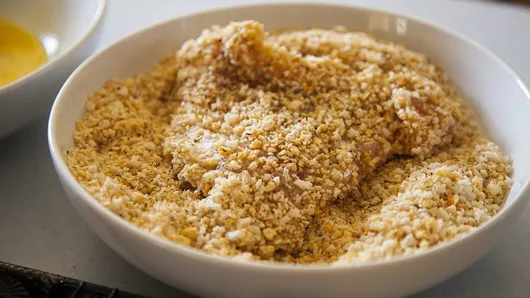 Step4Place chicken in seasoned flour; gently tap off excess flour. Place floured chicken into egg bowl; coat well. Coat chicken well with bread crumbs. (Make sure the chicken is covered with bread crumbs.) Place chicken on rack in pan. Repeat each step with remaining chicken breasts. Spray breaded chicken generously with cooking spray.