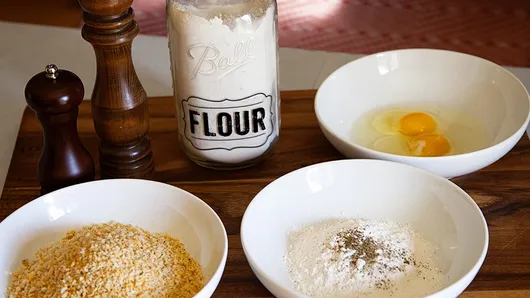 Step2Place flour in medium bowl; add generous amount of salt and pepper to flour. Beat eggs in second medium bowl. Place bread crumbs in third medium bowl. Set aside.