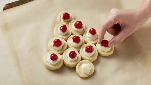 Step3In small bowl, mix cream cheese, 1/4 cup powdered sugar and the almond extract with spoon until mixed well. Spoon 1 rounded teaspoon cream cheese mixture on center of each dough round, spreading slightly. Top each with 1 cherry. Bake 16 to 19 minutes or until golden brown and dough is baked through.