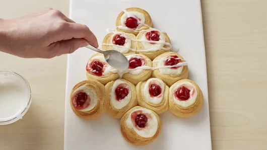 Nothing says happy holidays like a Christmas tree-shaped treat, and this pull-apart made up of mini crescent Danishes will be your new favorite. Each pastry gets filled with an almond-sweetened cream cheese mixture and scoop of cherry pie filling, then arranged into a tree shape before baking—no fussy dough rolling required!