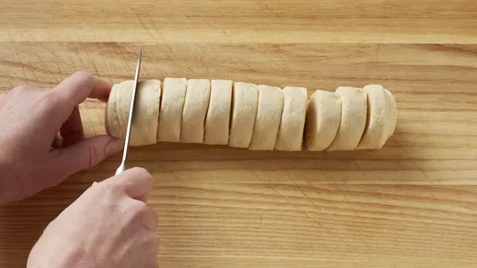Step1Heat oven to 375°F. Line large cookie sheet with cooking parchment paper. Remove dough from can; do not unroll. Using serrated knife, cut dough roll into 11 rounds.