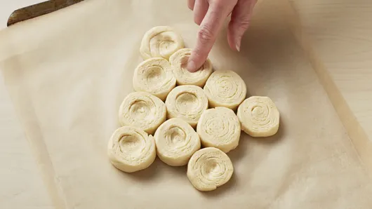 Step2Using photo as a guide, arrange dough into shape of tree on cookie sheet, spacing slightly apart, and ending with one round for the base. Gently press middle of each round to create a well for topping.