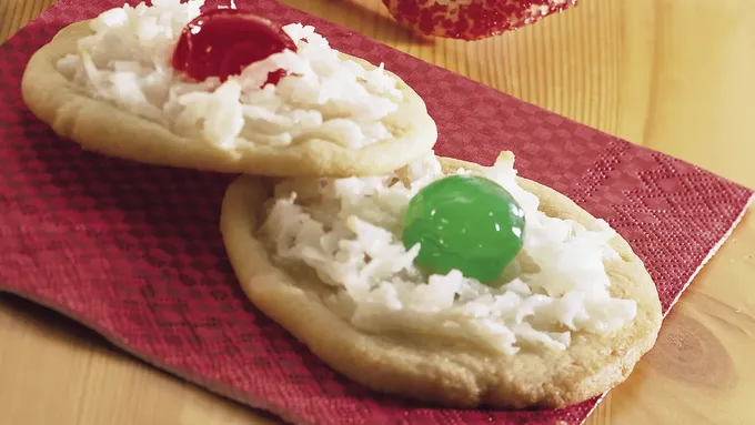 Step5With can of decorating icing fitted with star tip, pipe 1-inch star of icing (about 1 teaspoon) on center of each cookie. Dip cherries into melted chocolate; place on white icing on cookies. Let stand until icing is set and chocolate is firm, about 20 minutes. Store between sheets of waxed paper in tightly covered container.