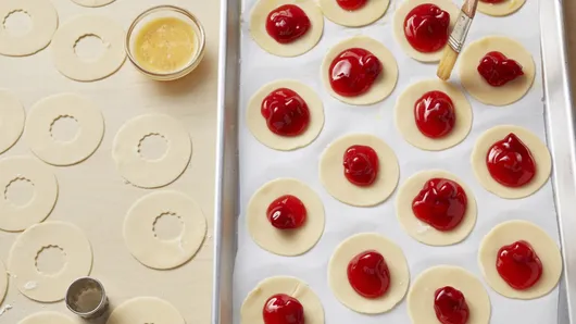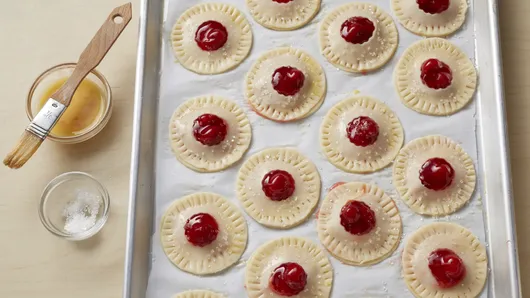 Step3Place 8 rounds on each cookie sheet. Spread 1 tablespoon pie filling in center of each round, leaving an edge. Brush edge of rounds with beaten egg. Using small (1 to 1 1/2-inch) cookie cutter of your choice, cut out center in each of the remaining 16 rounds. Top each bottom with cut out dough round, pressing down on outer edges with fork to seal.
