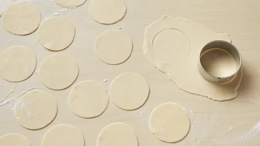 Step2Unroll 1 pie crust on lightly floured work surface. Using rolling pin, roll pie crust into 12-inch round. Using 3-inch round cookie cutter, cut out 16 rounds from pie crust, rerolling scraps as needed. Repeat rolling and cutting with second pie crust.