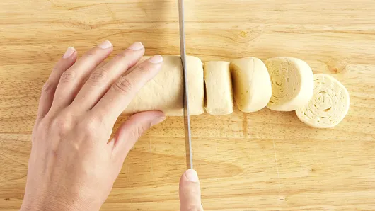 Step1Heat oven to 375°F. Line large cookie sheet with cooking parchment paper. Remove dough from can; do not unroll. Using serrated knife, cut dough roll into 11 rounds.