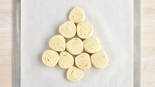 Step2Using photo as a guide, arrange dough into shape of tree on cookie sheet, spacing slightly apart, and ending with one round for the base.