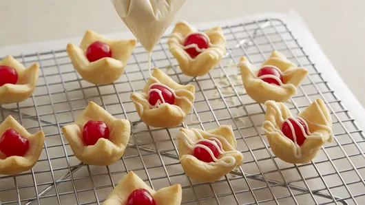 Step5Remove crescent cups from muffin cups to serving tray. Place 1 cherry in each cup. Cut a tiny corner off bag, and drizzle each cup with mixture.