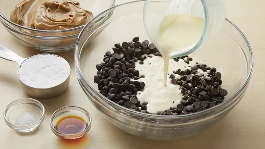 Step2Place chocolate chips in large bowl. In medium microwavable bowl, microwave 1 cup of the whipping cream uncovered on High 1 1/2 to 2 1/2 minutes or until very hot but not boiling. Pour hot cream over chocolate chips; stir with whisk until chocolate is melted and mixture is smooth. Stir in 2 cups of the peanut butter, 1/2 cup of the powdered sugar, 2 teaspoons of the vanilla and the sea salt until mixture is well blended.