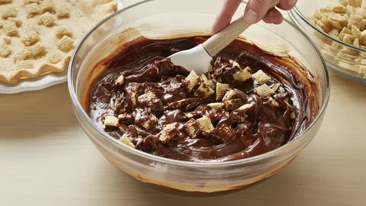 Step3Place 1/4 cup of the cereal evenly over bottom of baked pie crust. Add remaining cereal, 1 cup at a time, to the chocolate mixture; fold gently so cereal is not crushed. Spoon chocolate mixture over cereal in pie plate; spread evenly. Refrigerate uncovered pie about 2 hours or until set.