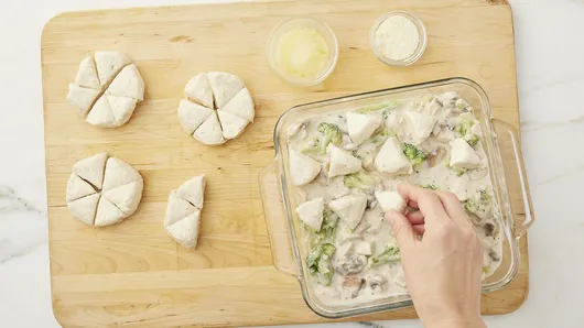 var configuration = {"title":"Chicken Alfredo Biscuit Casserole ","introduction":"Parmesan-crusted biscuits are the secret ingredient to making an extra-special chicken Alfredo casserole. This dish is loaded with creamy flavor and only takes 25 minutes to prep—making it the perfect go-to dinner for busy weeknights. Everyone will come running to the table once they smell this Chicken Alfredo Biscuit Casserole baking in the oven. And they won\u0027t need to wait long; this hearty bake can be ready to serve in under an hour.","servingSize":"1 Serving","image":{"small":{"media":"(min-width: 0px)","src":"https://mojo.generalmills.com/api/public/content/G-qVs2jhlU2-0gRNgqw0HA_webp_base.webp?v=abfac710\u0026t=e724eca7b3c24a8aaa6e089ed9e611fd"},"medium":{"media":"(min-width: 500px)","src":"https://mojo.generalmills.com/api/public/content/G-qVs2jhlU2-0gRNgqw0HA_webp_base.webp?v=abfac710\u0026t=191ddcab8d1c415fa10fa00a14351227"},"large":{"media":"(min-width: 767px)","src":"https://mojo.generalmills.com/api/public/content/G-qVs2jhlU2-0gRNgqw0HA_webp_base.webp?v=abfac710\u0026t=191ddcab8d1c415fa10fa00a14351227"},"alt":"Chicken Alfredo Biscuit Casserole "},"contributor":{"label":"By","name":"Pillsbury Kitchens","profileUrl":"/about-us","displayDate":{"label":"Updated","date":"Apr 22, 2021"}},"ingredientGroups":[{"ingredients":[{"quantity":"2","description":"tablespoons butter"},{"quantity":"2","description":"cups sliced fresh mushrooms"},{"quantity":"1/2","description":"cup chopped onion"},{"quantity":"1","description":"jar (15 to 16 oz) Alfredo pasta sauce"},{"quantity":"1/4","description":"cup milk"},{"quantity":"2","description":"cups chopped cooked chicken"},{"quantity":"2","description":"cups frozen broccoli florets"},{"quantity":"1/4","description":"teaspoon dried basil leaves"},{"quantity":"1","description":"can (10.2 oz) refrigerated Pillsbury™ Grands!™ Southern Homestyle Buttermilk Biscuits (5 Count) ","productLink":"/products/biscuits/grands-refrigerated-biscuits/homestyle-buttermilk"},{"quantity":"1","description":"tablespoon grated Parmesan cheese"}]}],"steps":[{"description":"Heat oven to 375°F. Spray 8-inch square (2-quart) glass baking dish with cooking spray."},{"description":"In 12-inch nonstick skillet, melt 1 tablespoon of the butter over medium heat. Cook mushrooms and onion in butter 5 to 6 minutes, stirring occasionally, until mushrooms brown and onion softens. Stir in Alfredo sauce, milk, chicken, broccoli and basil. Cook and stir until mixture is thoroughly heated and bubbly. Spoon into baking dish.","stepShotImageUrl":"//mojo.generalmills.com/api/public/content/fdMcdu4KtkC6_3itmgulcw_webp_base.webp?v=e641e8a8\u0026t=51a43a57af4046789e5a7f20567b1195"},{"description":"Separate dough into 5 biscuits; cut each into 6 pieces. Arrange in single layer over chicken mixture. In small microwavable bowl, microwave remaining 1 tablespoon butter uncovered on High 30 to 45 seconds or until melted. Brush biscuits with melted butter, then sprinkle with Parmesan cheese.","stepShotImageUrl":"//mojo.generalmills.com/api/public/content/dbRmsZLGSEyIH9liz2Uc5g_webp_base.webp?v=e8032857\u0026t=51a43a57af4046789e5a7f20567b1195"},{"description":"Bake 23 to 28 minutes or until biscuits are golden brown and biscuits in center of dish are cooked through on bottom. Let stand 5 minutes."}],"tips":[{"title":"","description":"To get all the Alfredo sauce out of the jar, add the milk to the jar after pouring the sauce into the pan; replace the lid and shake, then pour milk mixture into pan.","category":"Techniques","tipShots":[]},{"title":"","description":"Pulled rotisserie chicken works nicely in this chicken Alfredo casserole, but any leftover cooked chicken or turkey makes a nice substitute.","category":"Substitution","tipShots":[]},{"title":"","description":"Purchase presliced mushrooms to save even more prep time with this Chicken Alfredo Biscuit Casserole.\n","category":"Time Saving","tipShots":[]},{"title":"","description":"For extra flavor in your biscuit dinner casserole, add 1/4 teaspoon dried basil leaves to the chicken mixture.","category":"Variation","tipShots":[]},{"title":"","description":"Kitchen Tested - 3/2021.","category":"Kitchen Tested","tipShots":[]}],"kitchenTips":[{"title":"","description":"To get all the Alfredo sauce out of the jar, add the milk to the jar after pouring the sauce into the pan; replace the lid and shake, then pour milk mixture into pan.","category":"Techniques","tipShots":[]},{"title":"","description":"Pulled rotisserie chicken works nicely in this chicken Alfredo casserole, but any leftover cooked chicken or turkey makes a nice substitute.","category":"Substitution","tipShots":[]},{"title":"","description":"Purchase presliced mushrooms to save even more prep time with this Chicken Alfredo Biscuit Casserole.\n","category":"Time Saving","tipShots":[]},{"title":"","description":"For extra flavor in your biscuit dinner casserole, add 1/4 teaspoon dried basil leaves to the chicken mixture.","category":"Variation","tipShots":[]}],"additionalContent":[],"faq":[],"tipCategories":[{"categoryName":"Kitchen Tested","heading":"More About This Recipe","cssClass":"recipePartStory","expandOnInit":false,"expandText":"More +","collapseText":"Less -","expandEventName":"","collapseEventName":"","image":"","tips":[{"title":"","description":"Kitchen Tested - 3/2021.","category":"Kitchen Tested","tipShots":[]}],"isExpandable":false}],"nutritionInfo":{"configuration":{"showAsTable":false,"noNutritionInformationAvailableMessage":"No nutrition information available for this recipe","poweredByText":"\u003cp\u003eNutrition information for this recipe is estimated using a leading nutrition calculation application, but is an estimate only. Actual nutrition values will vary based on the exact ingredients or brands you may use.\u003c/p\u003e\n\u003ca href=\u0022http://developer.edamam.com\u0022\u003ePowered By \u003cimg src=\u0022-/media/C4F33FD467AB4A3AB59AAC4F6306AB04.ashx\u0022 alt=\u00