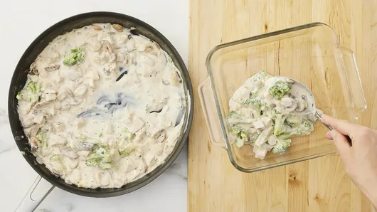 In 12-inch nonstick skillet, melt 1 tablespoon of the butter over medium heat. Cook mushrooms and onion in butter 5 to 6 minutes, stirring occasionally, until mushrooms brown and onion softens. Stir in Alfredo sauce, milk, chicken, broccoli and basil. Cook and stir until mixture is thoroughly heated and bubbly. Spoon into baking dish.
