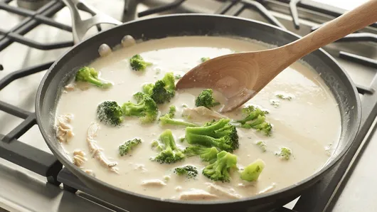 Step2In 12-inch nonstick skillet, cook chicken broth, cream cheese spread, salt and pepper over medium heat 6 to 8 minutes, stirring occasionally, until cheese is melted. Stir in chicken. Remove from heat. Stir in frozen broccoli until well blended.