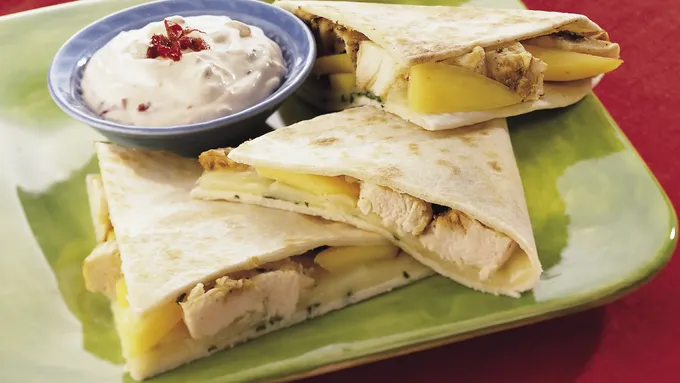 Step2In small bowl, mix sour cream and salsa. Spread about 1 1/2 tablespoons of the sour cream mixture over tortilla on cookie sheet. Top each with chicken, 1 tablespoon of the cheese, the corn and onions. Sprinkle with remaining cheese. Place remaining tortilla, butter side up, over filling; press gently.