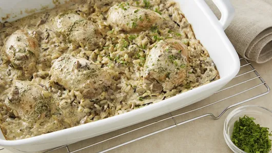 Step3Bake 1 hour or until juice of chicken is clear when center of thickest part is cut (180°F) and rice is tender. Sprinkle with parsley.