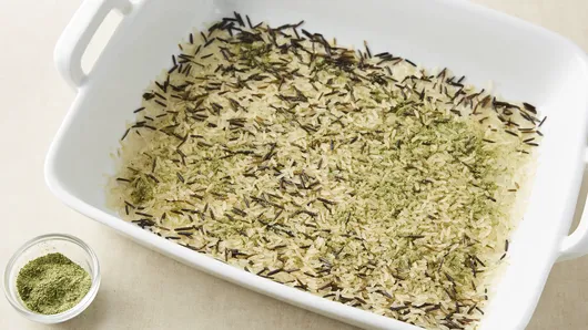 Step1Heat oven to 350°F. Spray 13x9-inch (3-quart) glass baking dish with cooking spray. Evenly spread rice in bottom of dish. Sprinkle half of contents of seasoning mix packet over rice.