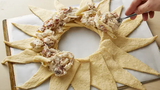 Step4Spoon chicken mixture on the half of each rectangle closest to center of ring.
