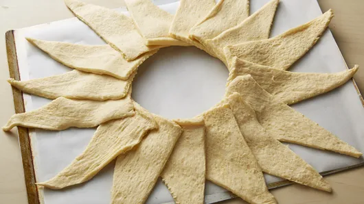 Step3Unroll both cans of dough; separate into 16 triangles. On cookie sheet, arrange triangles in ring so short sides of triangles form a 5-inch circle in center. Dough will overlap. Dough ring should look like the sun.