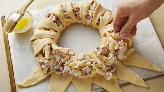 Step5Bring each dough triangle up over filling, tucking dough under bottom layer of dough to secure it. Repeat around ring until entire filling is enclosed (some filling might show a little). In small bowl, mix melted butter and garlic. Brush on top of dough ring.