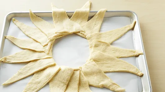 Unroll both cans of dough; separate into 16 triangles. On cookie sheet, arrange triangles in ring so short sides of triangles form a 5-inch circle in center. Dough will overlap. Dough ring should look like a sun.