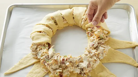 Spoon chicken mixture on half of each triangle closest to center of ring. Bring each dough triangle up over filling, tucking dough under bottom layer of dough to secure it. Repeat around ring until entire filling is enclosed (some filling might show a little). In small bowl, mix melted butter and garlic powder. Brush on top of dough.