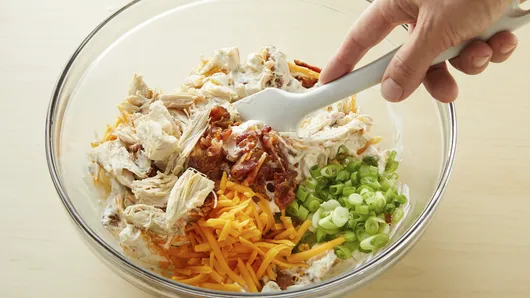 In large microwavable bowl, mix cream cheese spread, milk and ranch seasoning mix. Microwave uncovered on High 30 to 60 seconds or until heated slightly. Beat with whisk until smooth. Stir in chicken, cheese, bacon and 1/4 cup of the green onions.