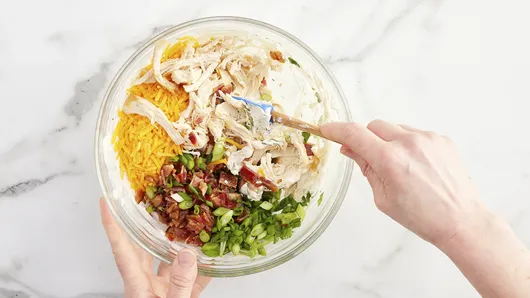 In large microwavable bowl, mix cream cheese spread, milk and ranch seasoning mix. Microwave uncovered on High 30 to 60 seconds or until heated slightly. Beat with whisk until smooth. Stir in chicken, cheese, bacon and 1/4 cup of the green onions.