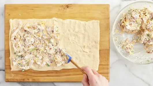 Starting on short edge of rectangle, roll up tightly and pinch seam together. Repeat for remaining dough and chicken mixture.