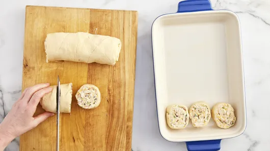 With serrated knife, carefully cut each roll into 6 slices, about 1 1/4 inches wide, and arrange spiral sides up in baking dish, reshaping into round shapes, if necessary.