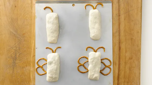Step3Separate dough into 5 biscuits. Press or roll each to form 5 1/2-inch round. Spoon about 1/3 cup broccoli mixture onto center of each round; fold dough over filling, pinching edge and ends of dough well to seal. Place rolls on cookie sheet, seam side down. Place 1 pretzel on cookie sheet under each side of dough rolls for wings. Break pretzels to make antennae; press under top of each roll.