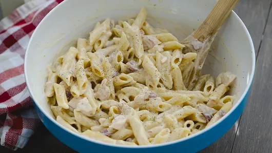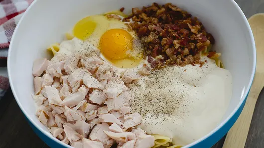 Step3In large bowl, combine drained cooked pasta, 1 lb boneless skinless chicken breasts, cooked, chopped, 1 jar (15 oz) Alfredo sauce, 3 tablespoons chopped cooked bacon, 1 egg and 1 teaspoon pepper; stir gently to combine. Pour mixture in baking dish.