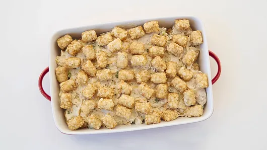 Step3Place half of the frozen potatoes in single layer on bottom of baking dish. Spoon and spread chicken mixture on top of potatoes; top with remaining potatoes. Bake uncovered 50 minutes; top casserole with remaining 1 cup cheese. Bake 8 to 10 minutes longer or until cheese is melted and potatoes are lightly browned.