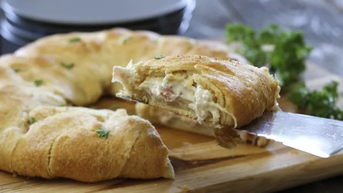 Step4Bake 18 to 23 minutes or until deep golden brown and crescent is baked through. Let stand 5 minutes before serving.