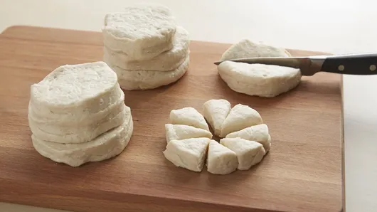 Step3Meanwhile, separate dough into 8 biscuits. Cut each into 8 pieces.