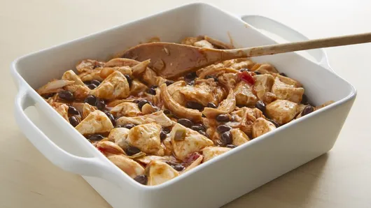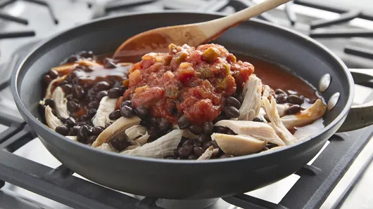 Step2In 10-inch nonstick skillet, cook chicken, beans, enchilada sauce and salsa over medium-high heat, stirring occasionally, 3 to 4 minutes or until hot. Spoon into baking dish.
