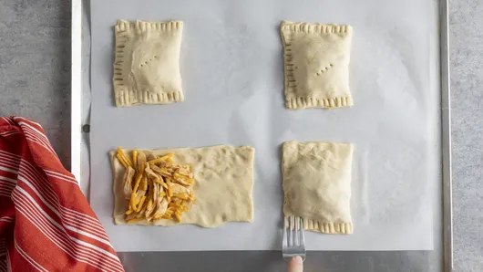 Separate dough into rectangles and place on a parchment paper lined baking sheet. Press the perforation lines on the crescent roll dough to seal completely. Top short side of each rectangle half with some of the chicken mixture. Fold dough from top over filling, firmly pressing edges with fork to seal. With fork, prick top of each to allow steam to escape.