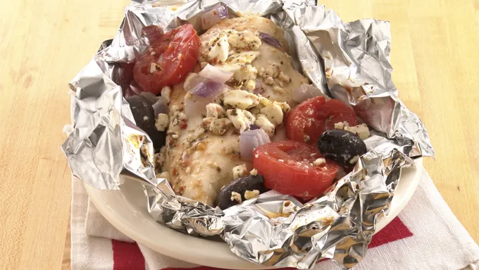 Step2Cut four 18x12-inch pieces of heavy-duty foil. Place 1 chicken breast half in center of each piece of foil. Top each with 1/4 of vegetable mixture. Wrap each packet securely using double-fold seals, allowing room for heat expansion.