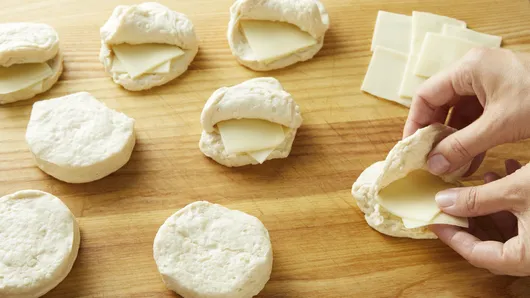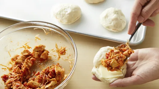 Holding opened biscuit in hand, place slightly less than 1/4 cup chicken mixture inside, pressing inside to fit. Gently stretch dough over filling, pressing and firmly sealing around edges of biscuit. Reshape into round, and place on cookie sheet. (Biscuits will be full.) Repeat for remaining biscuits.
