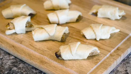 Step2Separate 1 can (8 oz) Pillsbury™ refrigerated crescent dinner rolls into 8 triangles. Place a 1-inch cooked chicken strip on wide end of each crescent. Roll up chicken toward point.