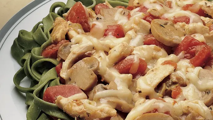 Step3Serve chicken over fettuccine. Top with sauce and Parmesan cheese.