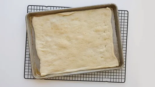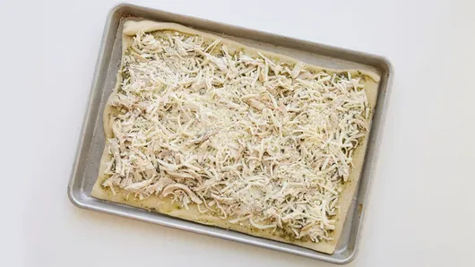 Step1Heat oven to 425°F. Spray 15x10x1-inch pan with cooking spray. Unroll dough in pan; press evenly to edges of pan. Bake 6 minutes.